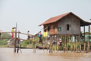 Imaginez un grand lac de plusieurs kilomètres, complètement entouré de montagnes, et dont les berges sont parsemées de minuscules villages sur pilotis. C’est magnifique! Et tellement différent du reste du pays, où tout est si sec à cette période de l’année, qu’on se retient d’éternuer de peur que tout le paysage s’effondre en un petit tas de poussière!