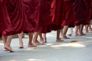 Le second arrêt, c’était la petite ville de Sagaing. Si j’ai bien compris, c’est comme un Club Med pour moines… 😉 Il y aurait environ 30 000 moines qui viennent se reposer dans un des 700 monastères de la ville (tout ça vient de mon chauffeur à l’anglais approximatif, alors si Wikipédia vous dit autre chose, croyez Wikipédia, de grâce!). C’est très beau, tout plein d’arbres immenses, sur le bord d’une rivière, avec des moines vêtus de rouge et orange partout. C’est charmant! Il y a (encore) une pagode au sommet, avec une vue incroyable!