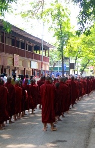 Le premier stop de la journée a aussi été le plus weird. Dans un monastère à Amarapura, à 10:30 tous les matins, les moines de ce monastère mangent, et étrangement, c’est un évènement public. Et c’est le genre de truc qui me mets vraiment mal à l’aise parce qu’on est soudainement une gang de touristes, bien accotés à regarder des moines recevoir leur nourriture et manger. Ce n’est pas très respectueux si vous voulez mon avis et j’avais un vague sentiment d’être dans un zoo à regarder des animaux exotiques dîner… Je suis partie après 5 minutes.
