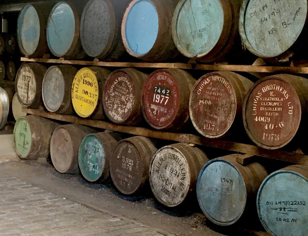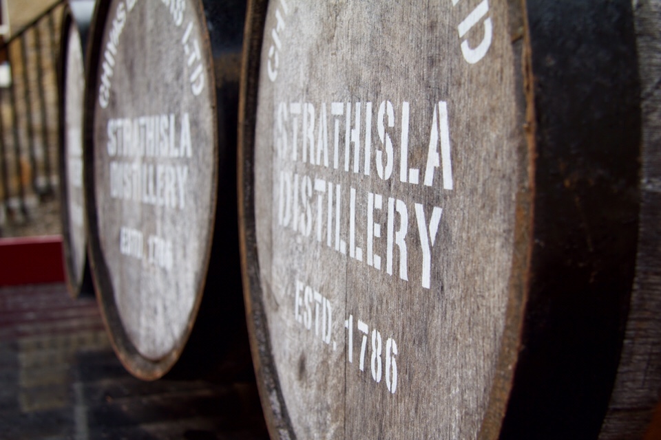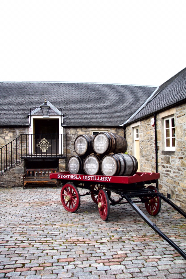 Distillerie Strathisla. Le berceau des whiskies Chivas (clin d’oeil papa!😉), la plus vieille distillerie encore en opération dans les highlands écossais. Les lieux sont magnifiques, de beaux bâtiments (clin d’oeil à mes architectes de service, j’avais écris bâtisses, oh sacrilège! 😉) en pierres, entourés d’arbres, sur le bord d’une rivière. Bucolique!